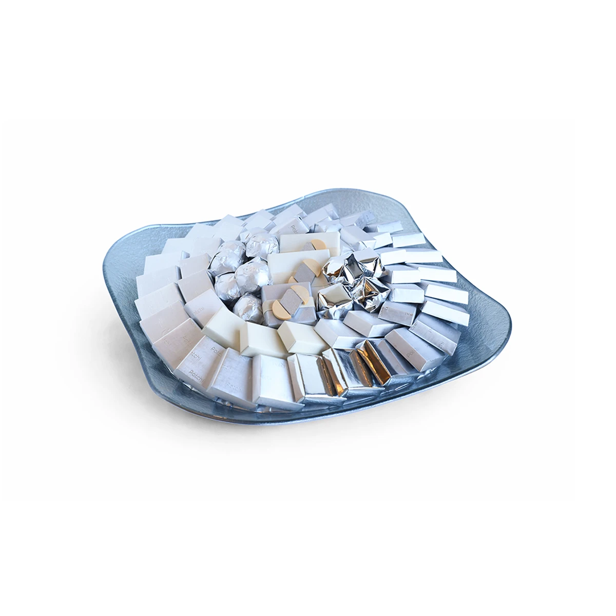 Designed for generous sharing, this silver square tray is filled with premium chocolates featuring rich fillings, bringing elegance and pleasure to every gathering.