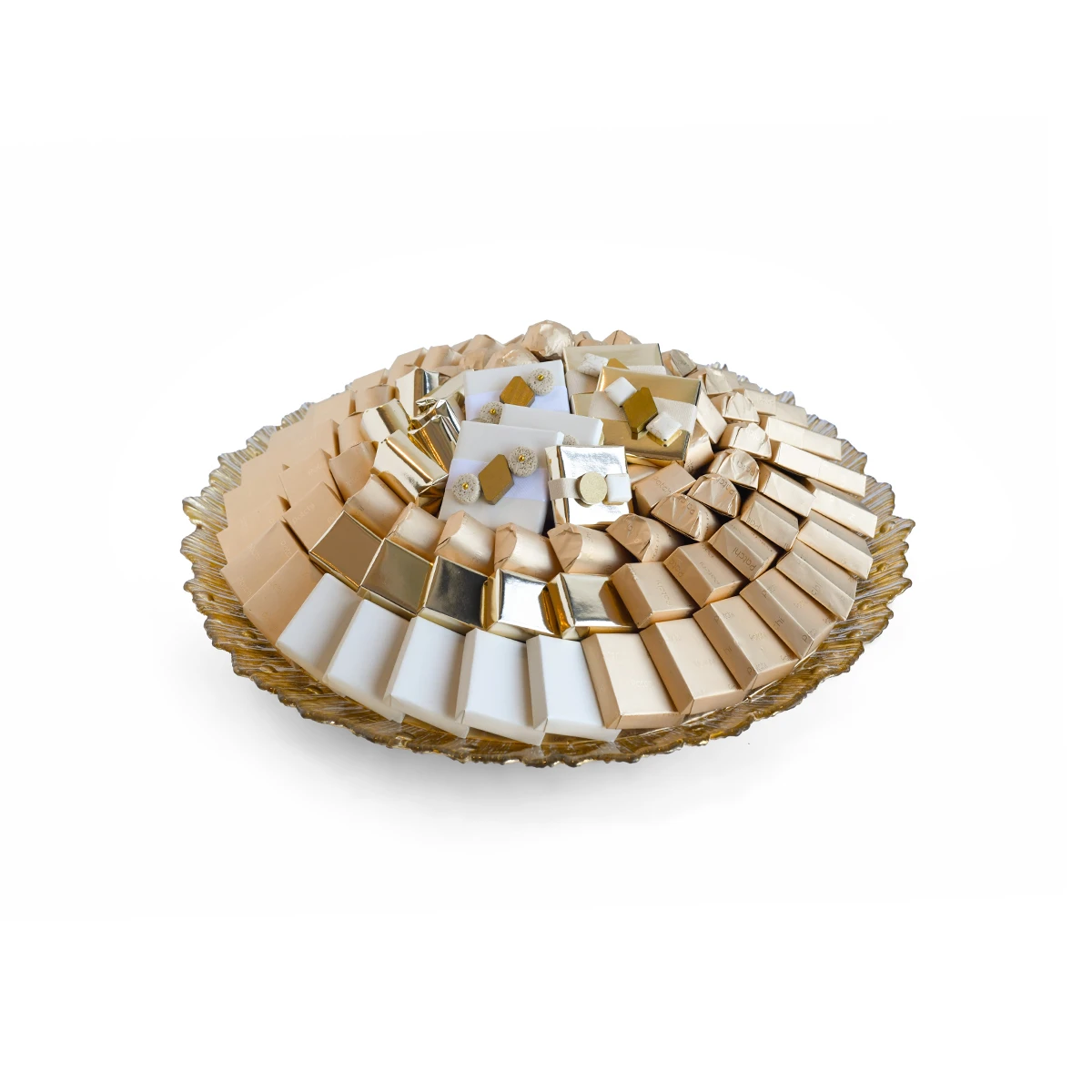 Created for grand occasions, this gold glass tray offers a generous assortment of premium chocolates, inviting everyone to share in the experience.