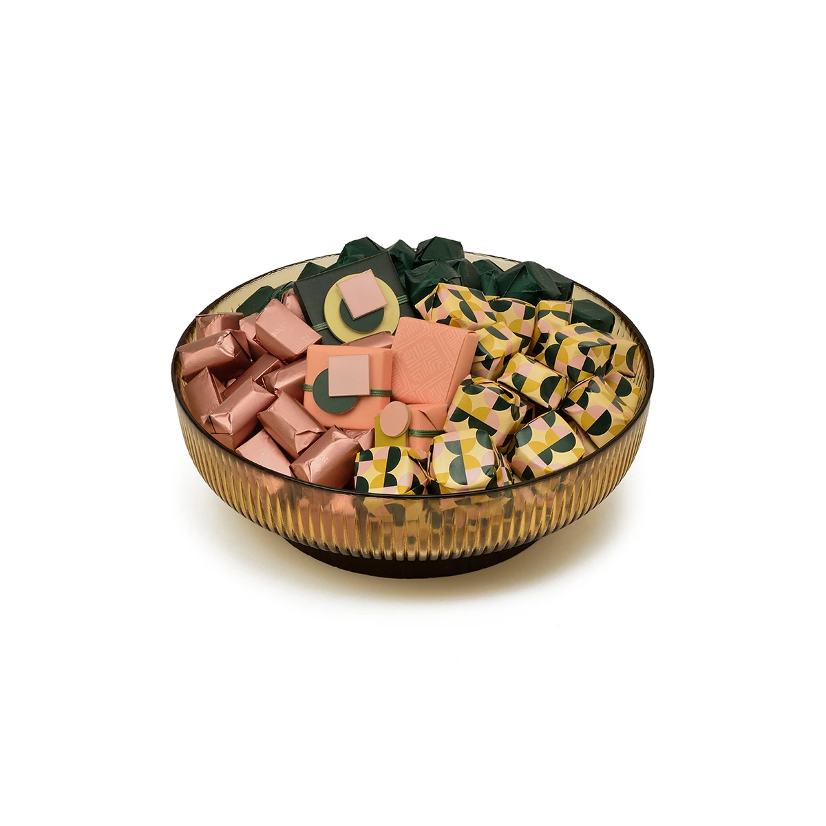 A generous 1900g yellow glass bowl overflowing with our curated fall chocolate collection — perfect as a centerpiece or to share at seasonal gatherings.