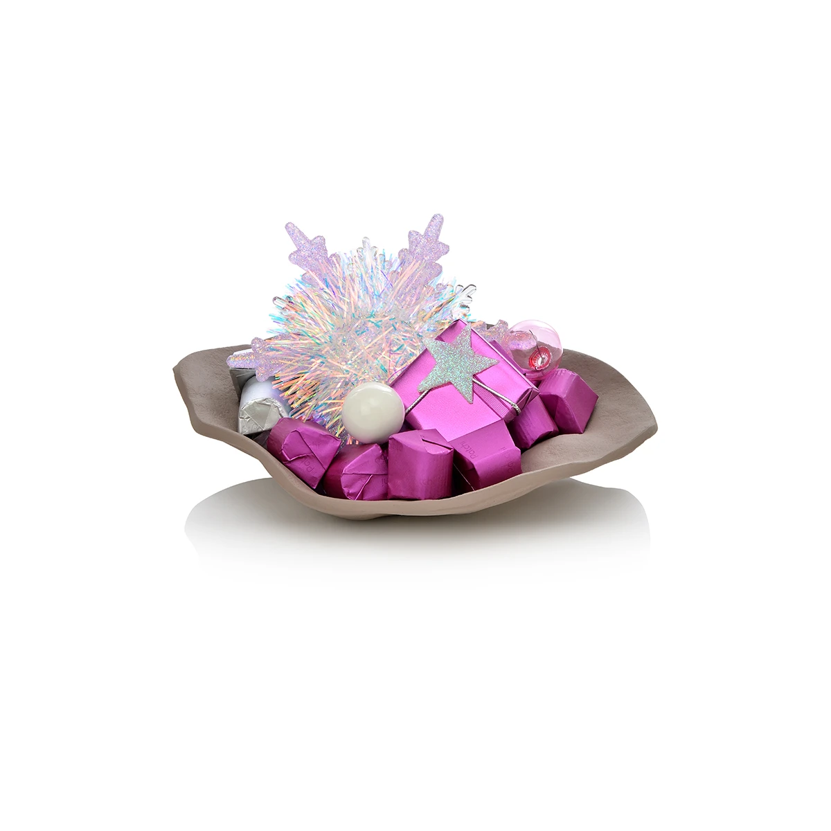 Choose a holiday gift that blends artistry and indulgence. This artistic metal bowl, with its distinctive handcrafted charm, is filled with a selection of holiday chocolates. Its organic shape gives it a touch of rustic elegance, making it a standout centerpiece for festive tables. Perfect for displaying during gatherings or gifting as a token of appreciation, this arrangement beautifully combines design and delight, capturing the magic of Christmas in every detail.
