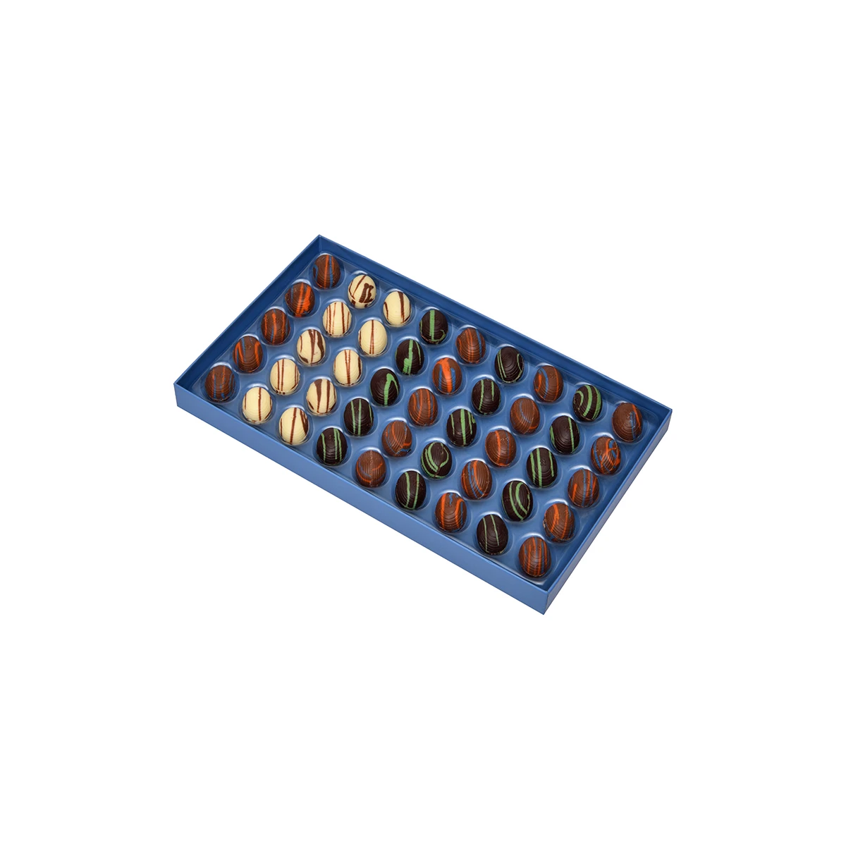 Enjoy a generous assortment of unwrapped chocolate eggs in vibrant colors and various fillings. From creamy chocolate cream to crunchy nuts and crispy crepes, this box is perfect for festive gatherings.